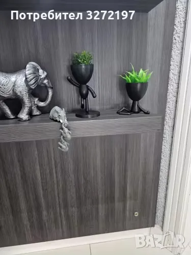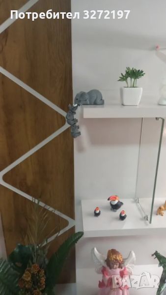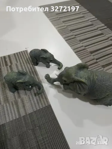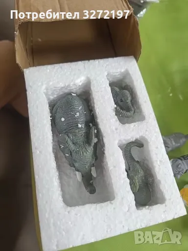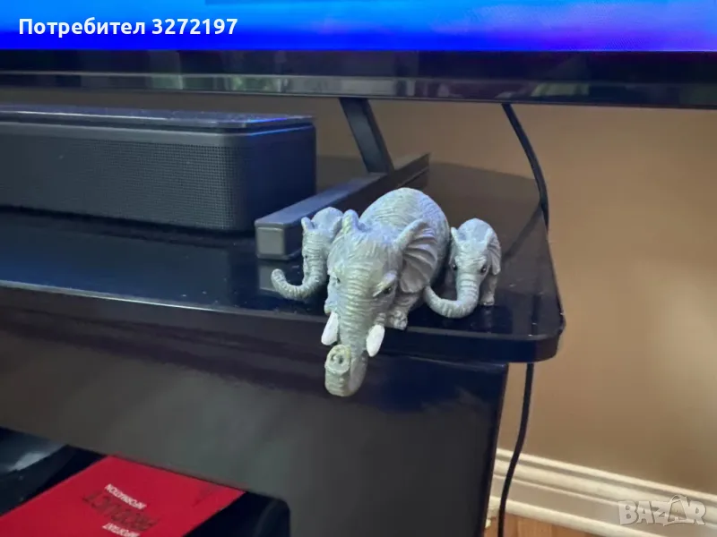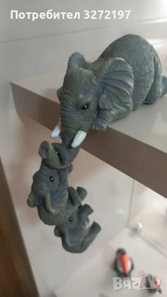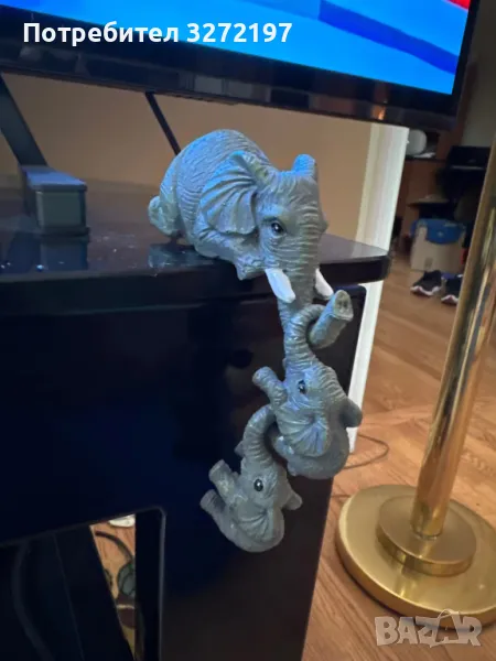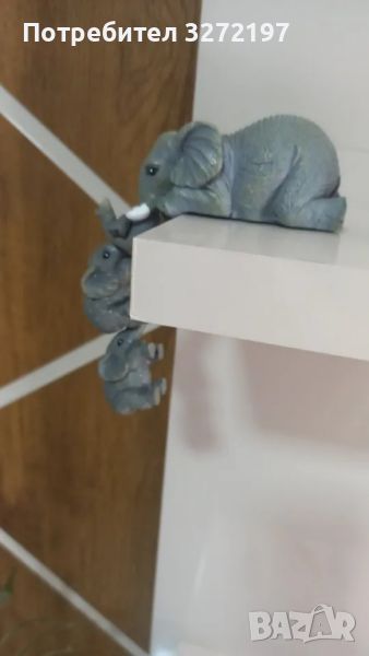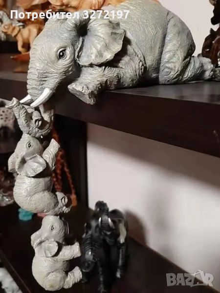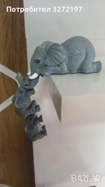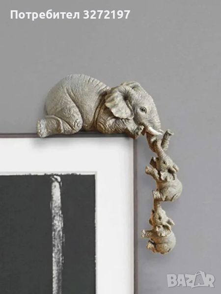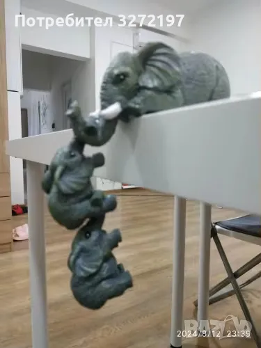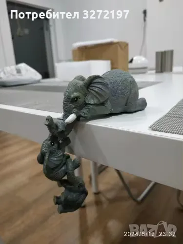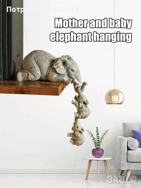 Описание: Слоницата майка седи на плоска маса или шкаф, а малкото слонче виси на хобота на слоницата майка.
