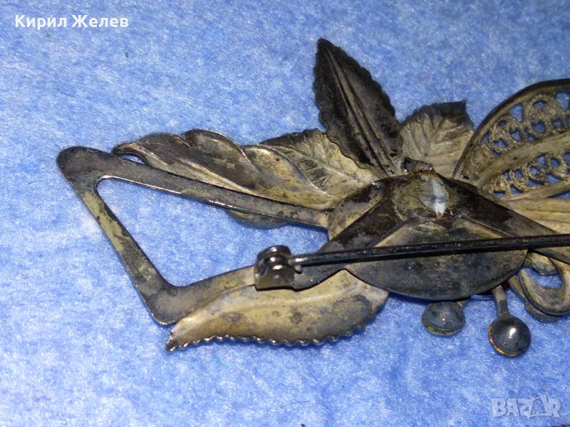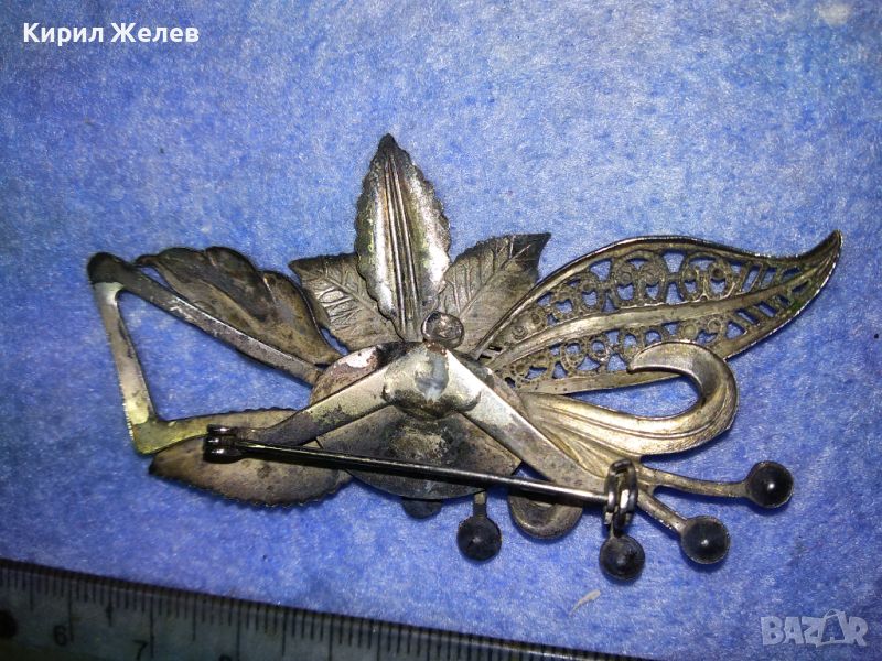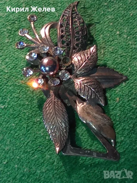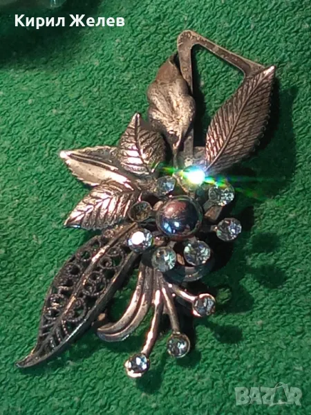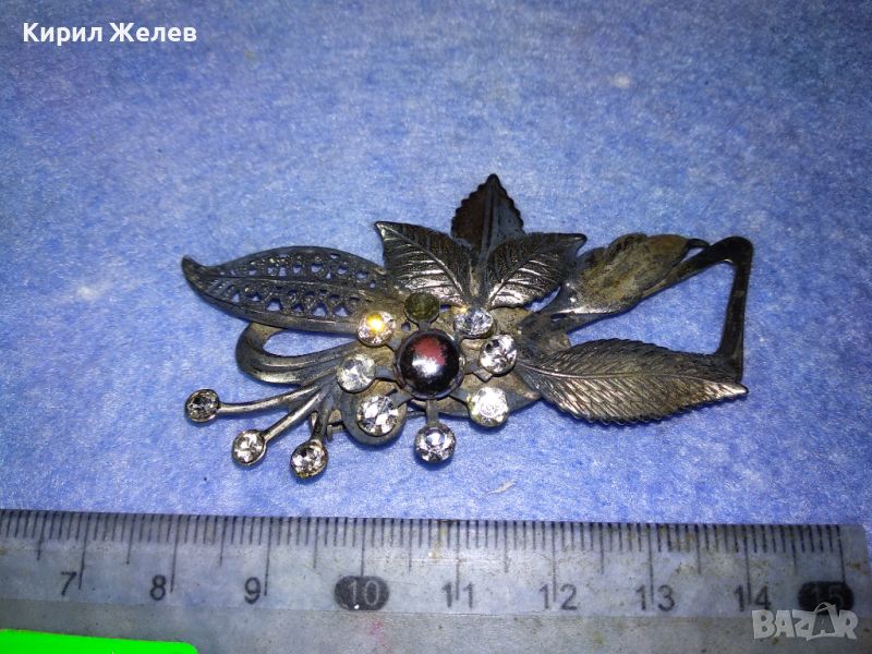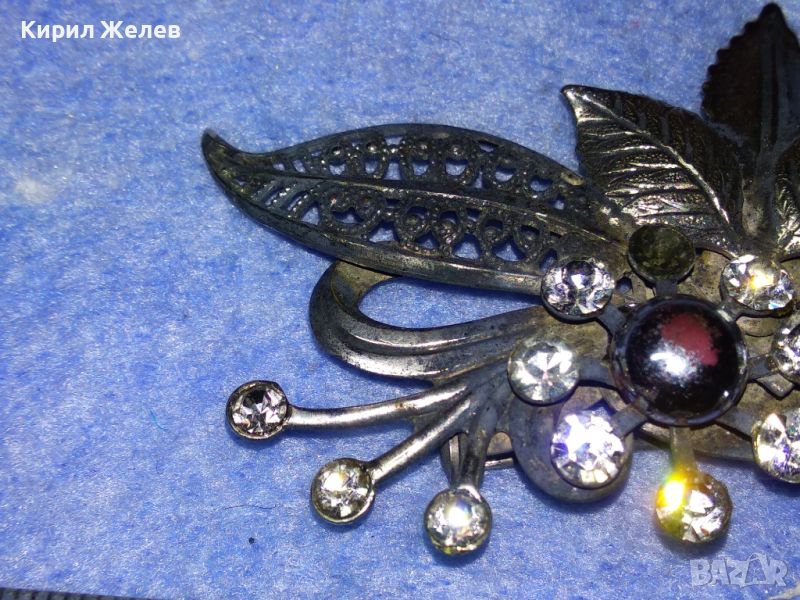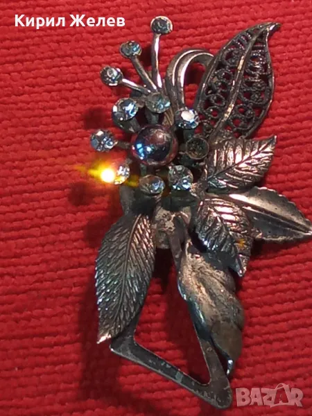 СТАРА ШАРМАНТНА ФЛОРАЛНА ПОСРЕБРЕНА с ОКСИДАЦИЯ РЕТРО АРТ БРОШКА с ФАСЕТИРАНИ КРИСТАЛИ 45621