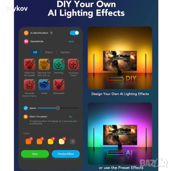 Изпитайте осветлението на станцията AI Gaming Sync Box Kit с AI чип и усъвършенстван алгоритъм, който разпознава вашите действия в играта в реално време и задейства съобразени със ситуацията светлинни ефекти върху RGBIC подсветката и интегрираните светлинни ленти. Освен това се насладете на бързо и точно съвпадение на цветовете за цялото ви гейминг, филмово и развлекателно съдържание