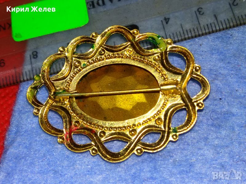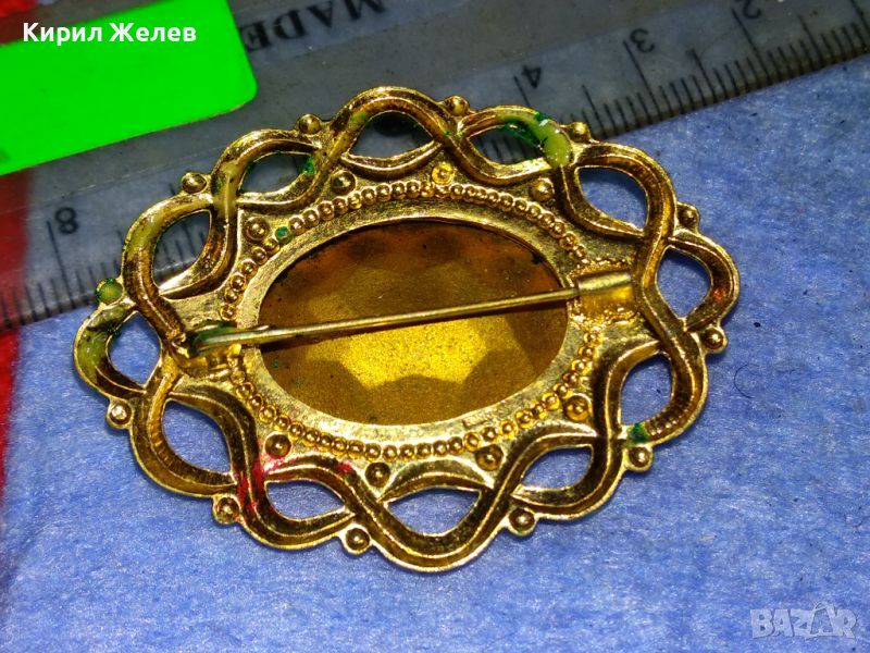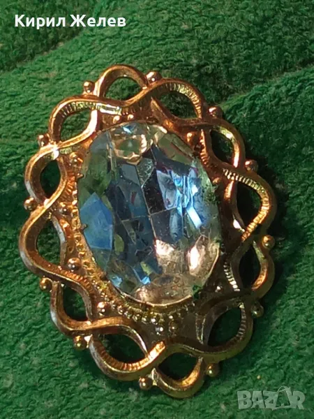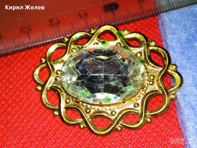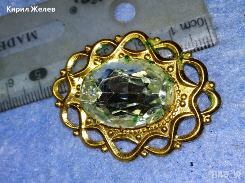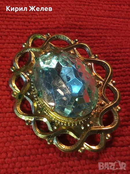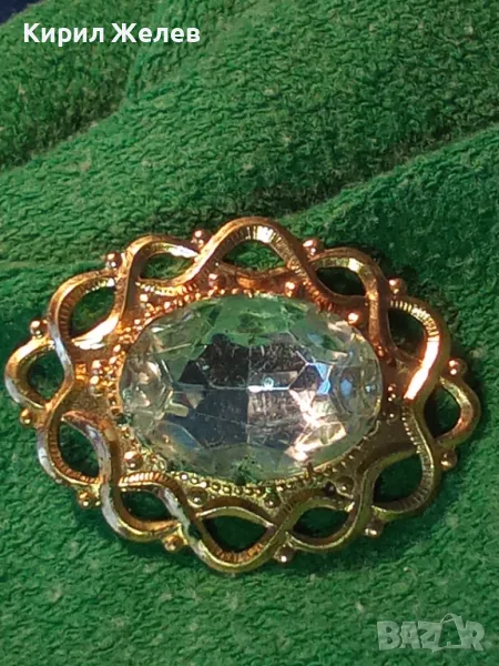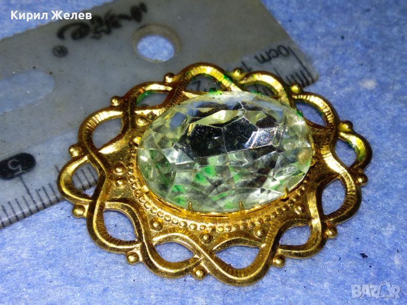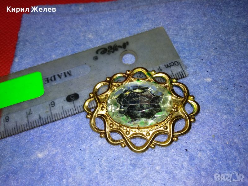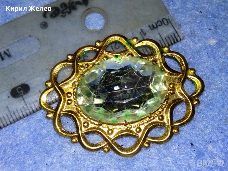 СТАРА ПОЗЛАТЕНА МЕДНА БРОШКА с ГОЛЯМ ФАСЕТИРАН ЗЕЛЕН КРИСТАЛ РЕТРО БИЖУ НАКИТ 44742