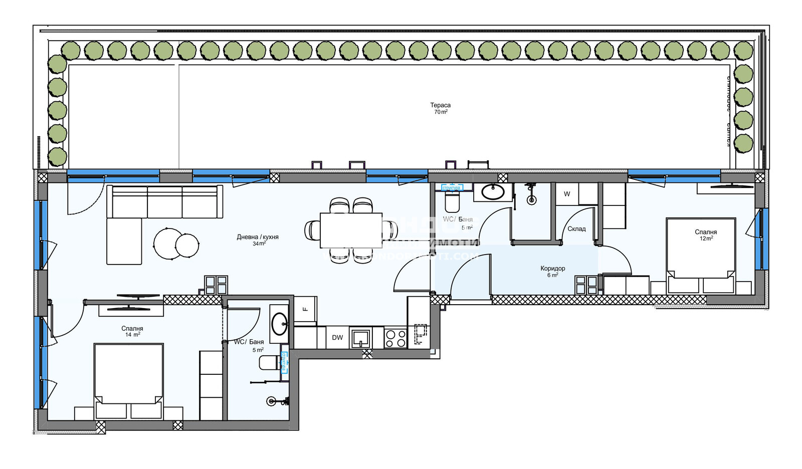 Оферта 64690:Представяме на Вашето внимание един новоизграден проект в комплекс от затворен тип в град Пловдив. Строителната компанията акцентира върху комфорта, безопасността и сигурността в своите комплекси, естетичното оформление на пространството около сградите и отлично развитата инфраструктура, сред която умело да бъдат съчетавани работа, развлечения, спорт и почивка. Апартаментът, които ви предлагаме се състои от ъглова дневна с кухненска част 34кв.м., две спални: детска 12кв.м. и родителска 14кв.м. с баня с тоалетна, втора баня с тоалетна, склад, входно антре с място за гардероб и една прекрасна панорамна тераса, обща за всички стаи. Най-новият проект на компанията е луксозен комплекс, който е разположен в северната част на град Пловдив, обграден от природа, която дава неподправено усещане за простор и спокойствие, с невероятна гледка към Родопите. Комплексът е базиран на концепцията за извънградски комплекс, където в голям терен се разполагат по-малки жилищни сгради, които предлагат спокойствието в покрайнините на града. В сградите има жилища с една и две спални, единични и двойни подземни и надземни гаражи, както и външни паркоместа. На входа на всяка сграда е поставена система за индивидуален чип, високоскоростни асансьори, а вътрешнопарковото пространство е решено в богата висока и ниска растителност, заобиколена от живописни зеленина, детска площадка и площ за спорт. Благодарение на ниската си плътност на застрояване, архитектурния си дизайн и добрата ориентация, комплексът е предпочитано място, което осигурява на обитателите си спокоен и качествен живот. Осигурено Банково Финансиране с изключително Изгодни условия за клиенти на Агенцията от Водещи Банки !!!