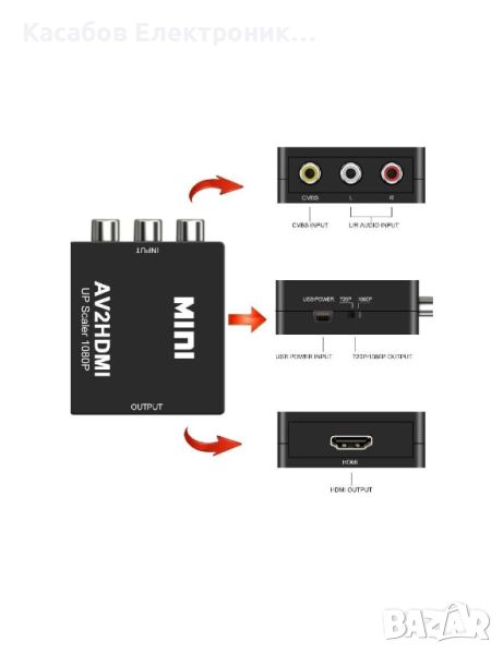 Преобразувател на AV към HDMI сигнал. Благодарение на него можете да свържете стари устройства, като видеорекордери, DVD, Pegasus или стар Playstation, към нов телевизор с HDMI порт. От една страна свързваме звука и изображението чрез RCA конектори, известни като чинчове, а от друга имаме HD\aaMI порт за свързване към телевизора с кабел.