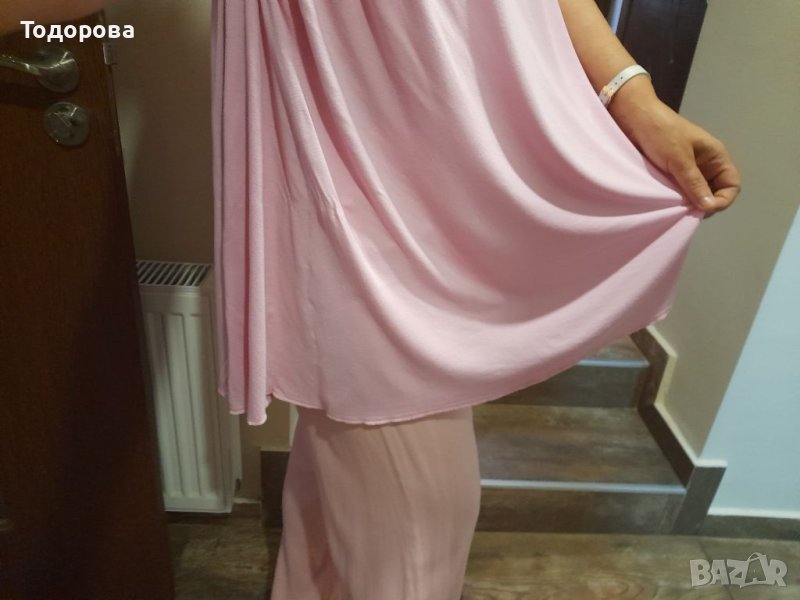 Дамски летен комплект от широк панталон ,лека материя и красив потник с памучна дантела отгоре , а надолу силно разкроен с дължина под ханша. Цвета е бледо розов. Вижда се как стои на номер Л