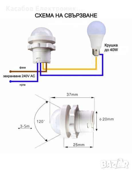 Малък PIR сензор, който може да включва осветление или друго устройство, захранвано от 240V с мощност не повече от 40W. Той ще работи добре в LED лампи, обикновени лампи или като тригер за всяко устройство, захранвано с променлив ток. След засичане на движение, модулът пропуска напрежение за период от 30 секунди. Ако движението е непрекъснато, времето за действие е по-дълго. Модулът работи и в тъмни помещения, а разстоянието на засичане е приблизително 5 метра. Комплектът включва конектор с удължителни кабели.