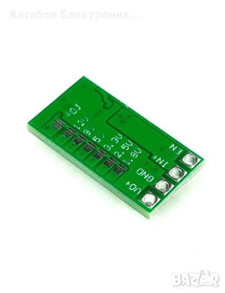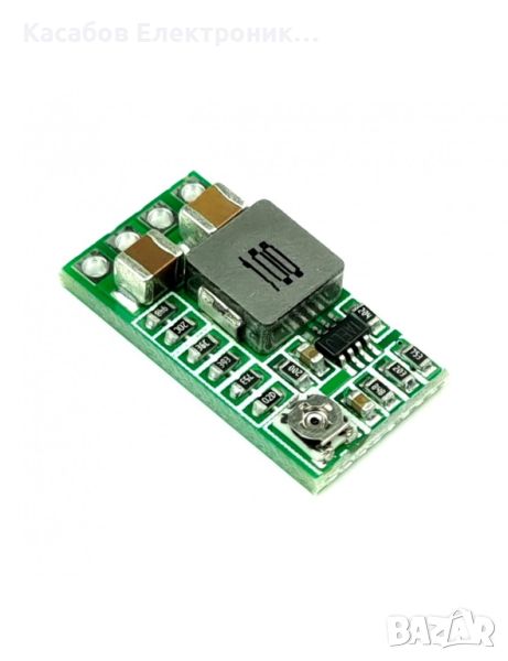 Преобразувателят е много малък, има вграден потенциометър за плавно регулиране на изходното напрежение, а отзад е възможно перманентно да се настрои напрежението чрез запояване на джъмпер на избрана стойност като: 12V, 5V, 3,3V, 2,5V, 1,8V