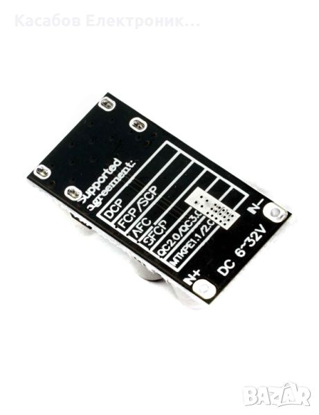 Модул за зарядно, поддържа най-популярните стандарти за бързо зареждане. Работи с входно напрежение в диапазона от 6V до 32V, като дава стабилни 5V на изхода, а при свързване на устройство, което поддържа бързо зареждане (quick charge), напрежението се регулира автоматично в диапазона от 3V до 12V.