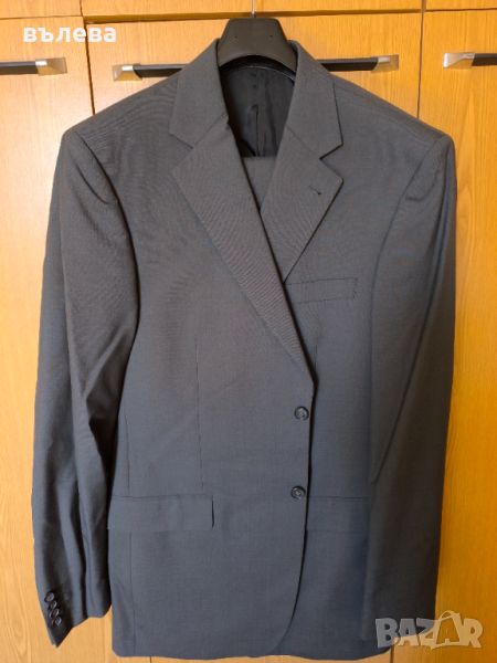 Нов мъжки елегантен костюм, цвят сив, сакото е с две цепки отстрани, гръдна обиколка 120см, талия 116см, ханш 124см, дължина на сакото 88см, дължина на ръкава 68см, панталон с дължина 107см, талия 104, ханш 120см, ширина на бедрото 62см.Подходящ и за абитуриенти.Плат 55%вълна и 45%полиестер.