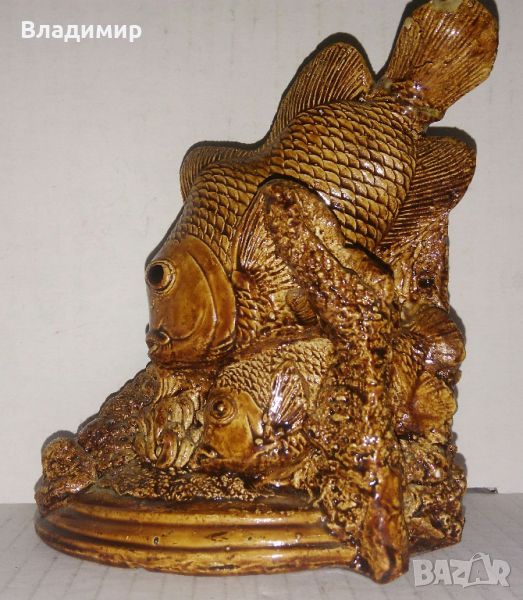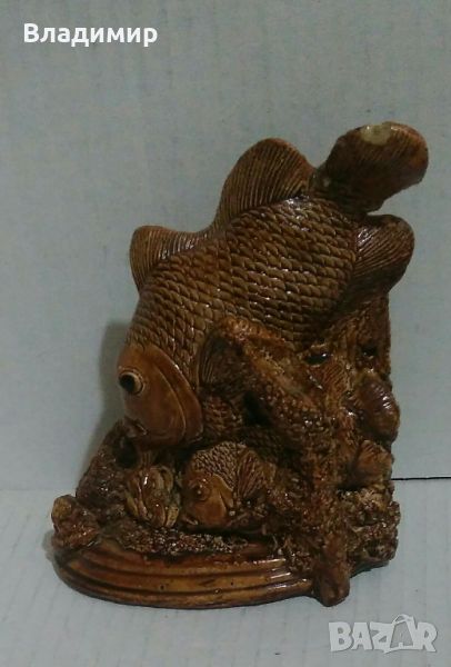 2) Статуетка на риби в светло кафяв цвят, (снимки 10, 11 и 12) - има лека забележка в горния край, показано на снимката - цена 12 лева;