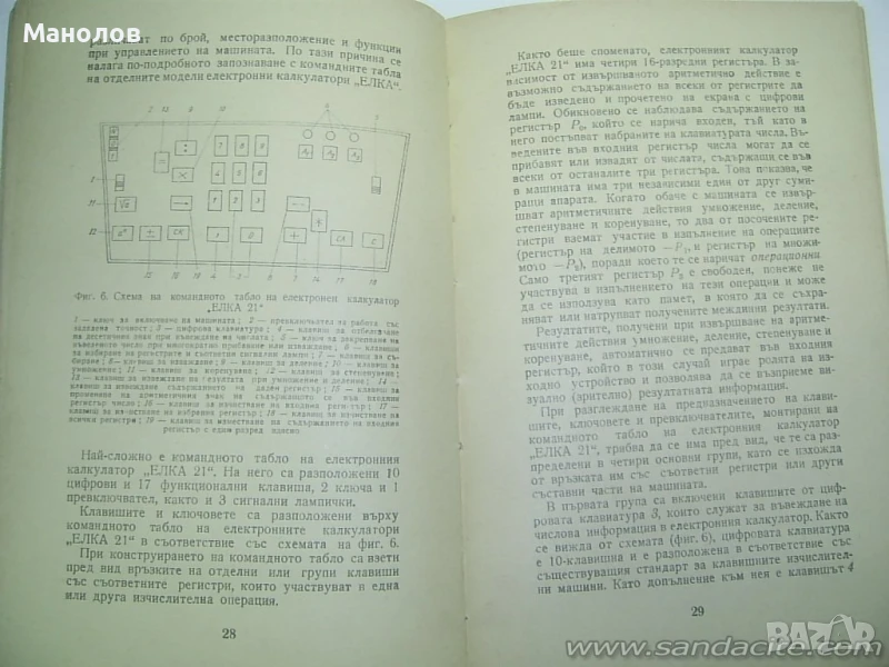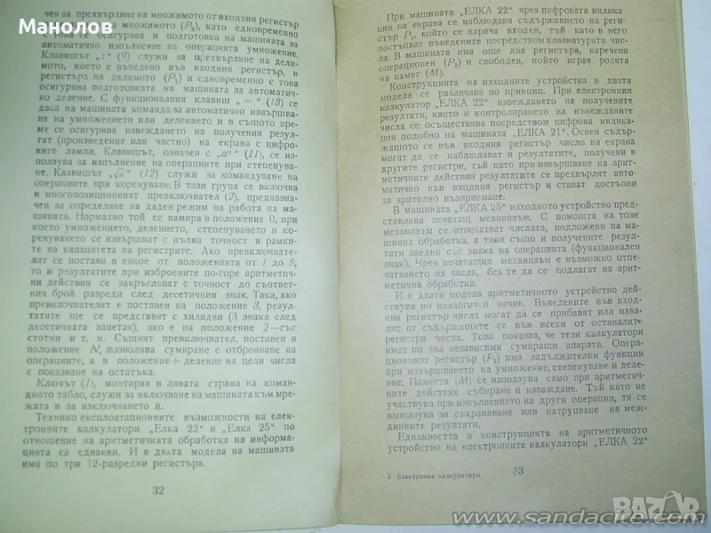 Продавам Пьрвия Бьлгарски Електронен Калкулатор ЕЛКА 6521 от 1965г с резервна касета с платки. Сьс Оргиналната Фабрично Заводска Документация на Завод Електроника София. В която има пьлно описание за работата на феромагнитната памет и инструкции за тестов режим на калкулатора! С книгата "Електронни Калкулатори" в която има пьлни инструкции за работа с Калкулатора. Кьм комплекта добавям още 12 цифрови лампи. Или общо 28 резервни цифрови лампи. Всичко се продава коплект! Настоящата обяснителна записка към технологичната документация на Електронен калкулатор "Елка6521" е задължителна за всички производствени поделения, лимитно бюро, ПДБ, ОТРЗ,МНК и ОТК при производство на Електронен калкулатор без главна кабелна форма. Блокова Схема На фигурата е показана блоковата схема на електронния калкулатор. С по-плътните линии са показани пътищата, по които протича цифровата информация. Възлово устройство, през което преминава цялата информация, се явява информационният регистър ИР. Паметта служи за съхраняване на четири 16 цифрени числа. Обработката на информацията се извършва в суматора Е, който заедно с ИР представява аритметичното устройство на калкулатора. За обработката на информацията за десетичната точка / порядъка на число се използува специален брояч BW. ИУ представлява изходящо устройство, вкючващо в себе си индикаторните лампи. Управляващото устройство УУ координира работата на отделните блокове при всяка операция и управлява схемите за извършване на различните аритметични и неаритметични действия. Всички операции в машината се извършват асинхронно, т.е. последователно и независимо. Известен синхрон е въведен само в блока за индикацията. Това дава възможност да се постигне голяма гъвкавост на схемите, да стане възможно извършването на такива сложни операции като коренуването чрез сравнително прости схемни решения. Съставил Авгарски. Проверил Йорданов 13.12.71 б- 416/71г. 16.12.71г. н. Контрол Атанасов 20.12.71г. Инструкция за работа ИР-1 стр.12 Елка 6521 – Първият български електронен калкулатор