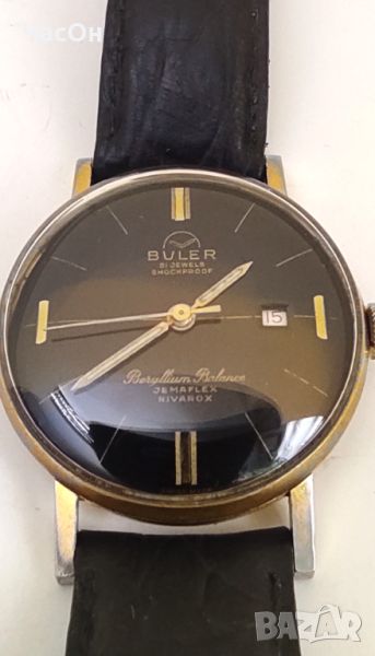 Много рядък и запазен швейцарски часовник BULER с 21 рубина. Модел от 60-те години на миналия век. Красив – с позлатена каса, черен циферблат и фини, златисти маркери. Секундарна стрелка и дата, сменяща се коректно. Светещи стрелки. Дълъг ход при пълно навиване. Касата е запазена, с леко изтрита на две места позлата само в долната част, откъм китката. Стъклото е сменено, по