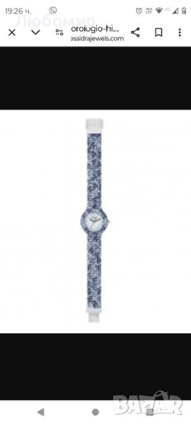 каишка с принт на сини цветя; затваряне на клипса. Водоустойчив до 50 метра дълбочина. Принадлежи към колекцията Spring Fever. Артикул HWU0994
