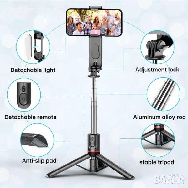 Стабилен статив за селфи стик със запълваща светлина, 44-инчов разтегателен селфи стик с безжично дистанционно управление и стойка за статив 360 ротация за iPhone 15/14/13/12/11 Pro/XS Max/XS/XR/X/8/7, Samsung и смартфон