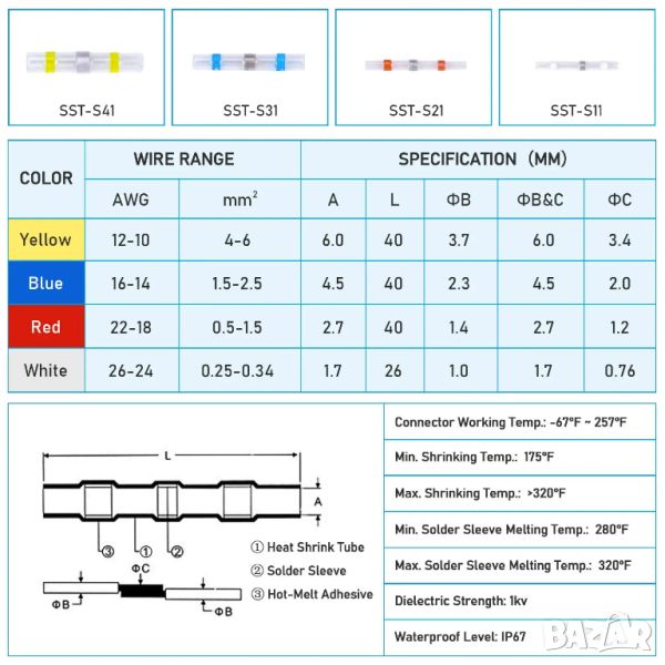 • ✔ БЪДЕТЕ ОРГАНИЗИРАНИ:Цветно кодираните тръби улесняват идентифицирането на правилния размер на конектора за всяко приложение. Асортиментът от конектори включва бели (AWG 26 – 24), червени (AWG 22 – 18), сини (AWG 16 – 14) и жълти (AWG 12 – 10) конектори за запояване, които могат да се използват на проводник AWG от 26 до 10.