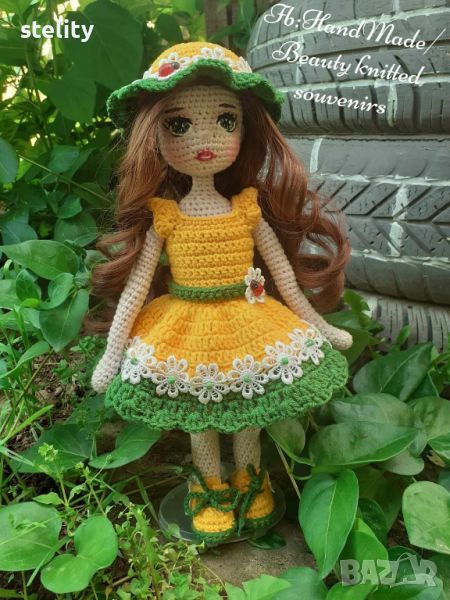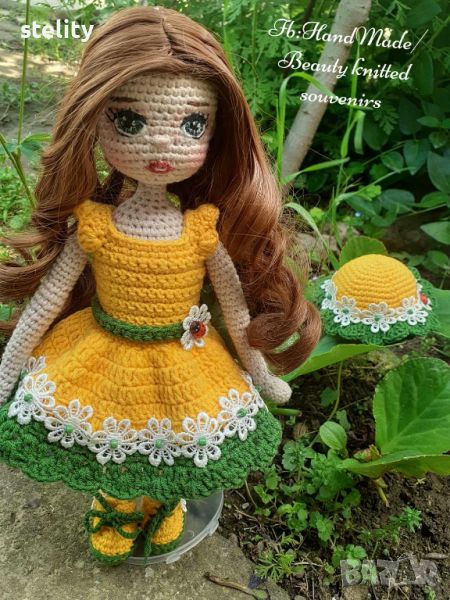 Изработена е от памучна прежда, без остри предмети. Напълно безопасна. Височината ѝ е 28 см. Дрешките се събличат.