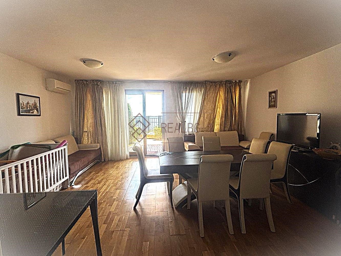 Имотът е завършен 'до ключ' и напълно обзаведен, готов за нанасяне. Допълнително, апартаментът разполага с двор, който не е включен в обявената квадратура.