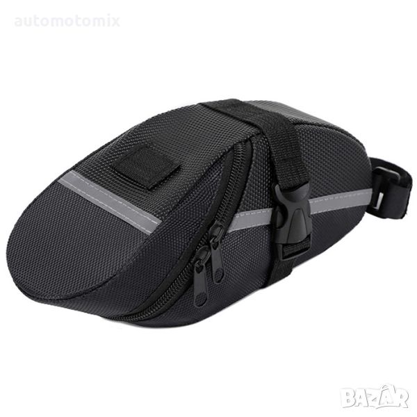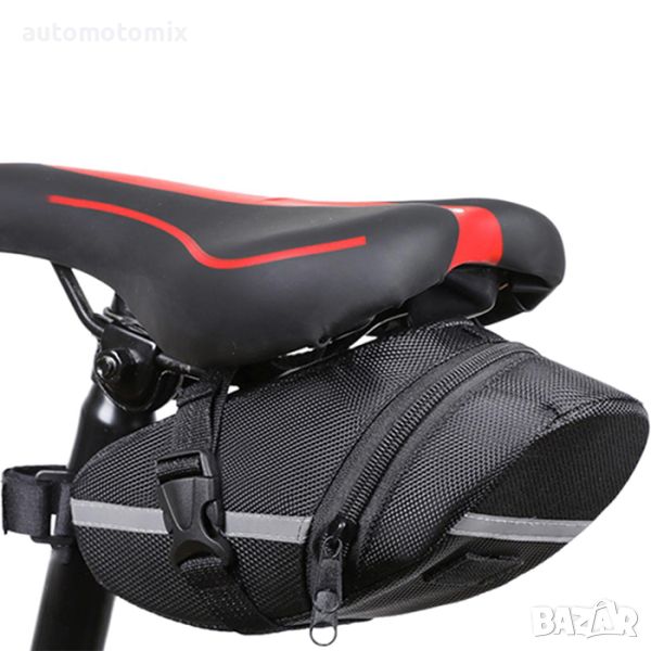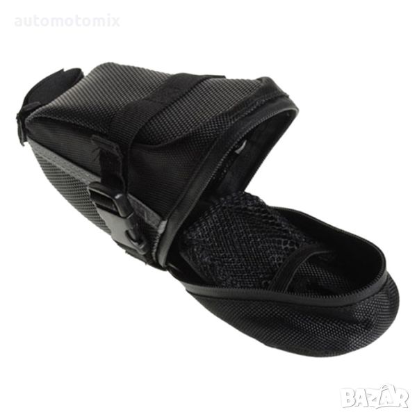 Чантата е частично заздравена и изработена от устойчив на износване материал и може да бъде прикрепена към колчето на седалката с велкро и закопчалки от долната страна на седалката.