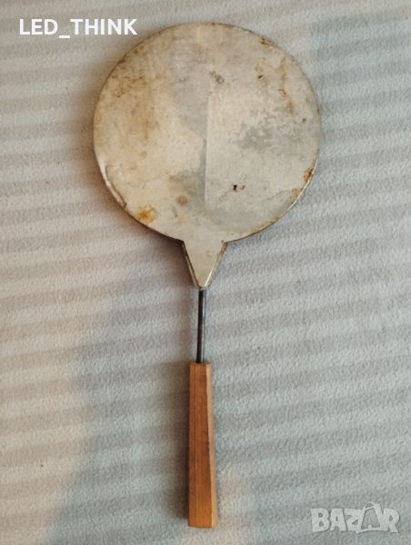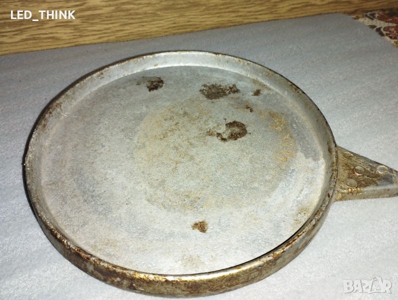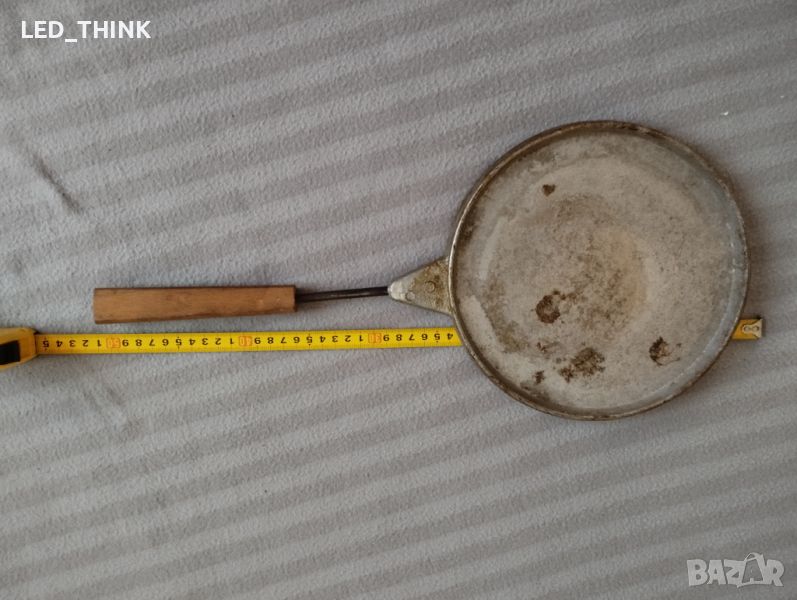 Диаметър 22см. Дължина с дръжката 50см. Яка отливка ръчна изработка от твърд алуминий. Качествено изпълнение от майстор. Ползван, доказано качество.