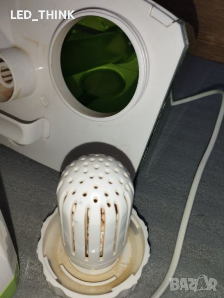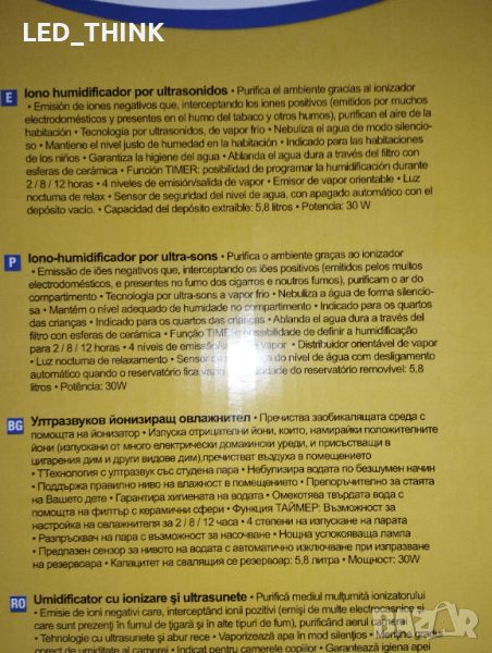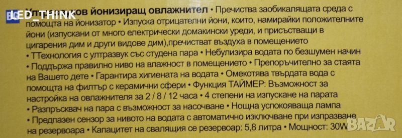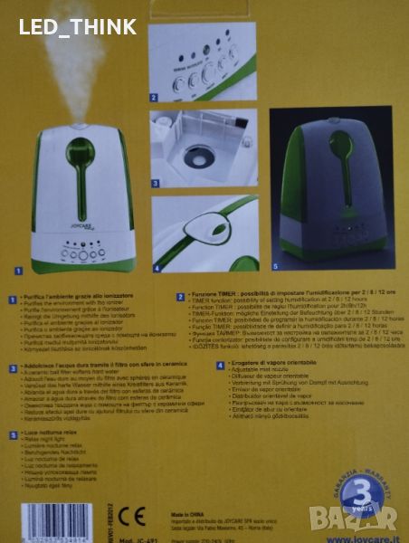 Работи с вибрация на мембрана, която оросява водата на много фини капчици и я издухва в стаята. Има йонизатор. На най-високата степен става гьолче около уреда. За цветенца е супер ако имате наоколо, много ще се радват и може да ви благодарят за влажността ако ги чуете да го казват. Монтирано е копченце в случай, че спре тока и пак дойде да си продължи работа. Може да се ползва копченцето на 1 или на 0, което значи 0 = без рестартиране при спиране на тока. Функции, таймер, екстри, вижте снимките. Има кошничка с минерали за здраве - това което се навива към каната. Идва с оригиналното кашонче.