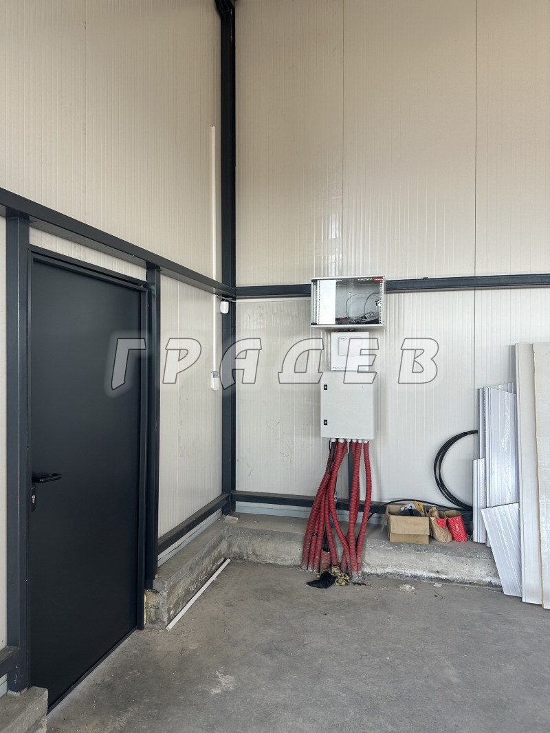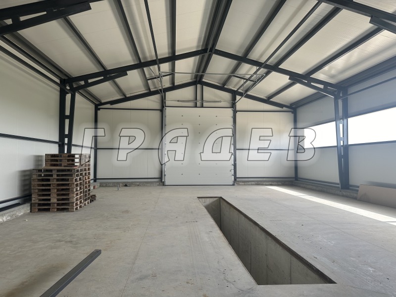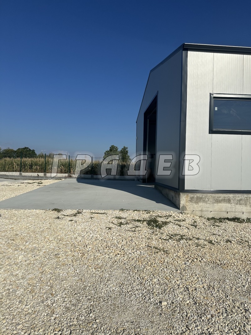 АГЕНЦИЯ ГРАДЕВ отдава чисто нов склад с 240 кв.м застроена площ и прилежащ парцел от 3600кв.м.Халето е с височина на билото 6м., с размери - дължина 20м и широчина 12 м.Сградата е с две големи врати с размери - ширина 4м. и височина 4.60м.Наличие на ток, вода, трифазен ток,вътрешен канал с дължина 8м. и дъбочина 1.80м.Имотът е с монтирана модерна алармена система с 8 бр. IP камери ден/нощ, вградена бяла светлина LED светлина с обхват 30м., вградена ColorVu технология за цветна картина при пълна тъмнина.По противопожарни изисквания в двора има вкопана 25000 литрова цистерна за вода.По желание на потенциален клиент ще бъде изградена офисна част със санитарен възел.