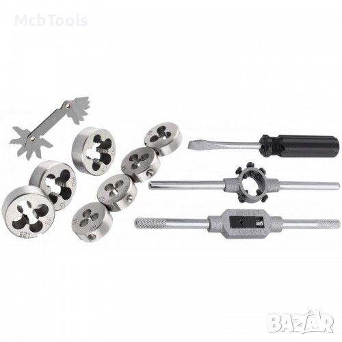 състои от върток за метчик, върток за плашка, отвертка, резбомер, 7 кръгли плашки и 21 ръчни метчика.