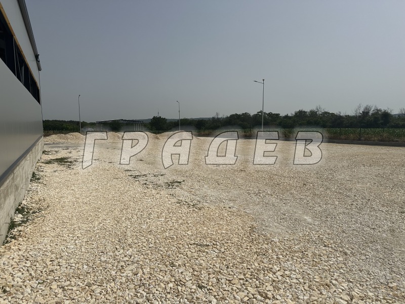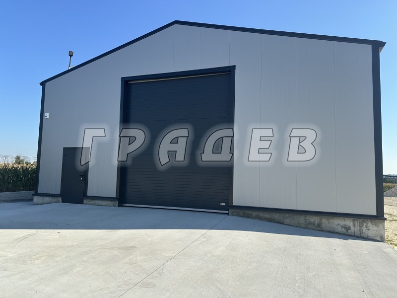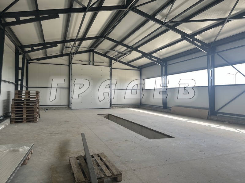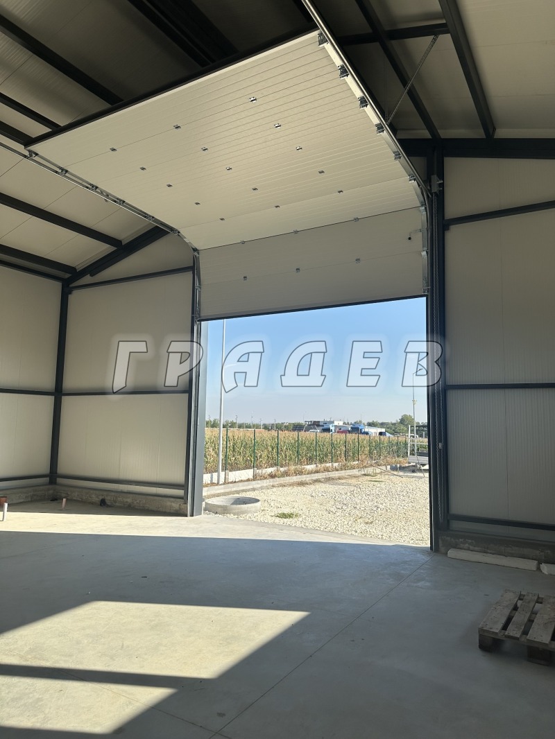АГЕНЦИЯ ГРАДЕВ отдава чисто нов склад с 240 кв.м застроена площ и прилежащ парцел от 3600кв.м.Халето е с височина на билото 6м., с размери - дължина 20м и широчина 12 м.Сградата е с две големи врати с размери - ширина 4м. и височина 4.60м.Наличие на ток, вода, трифазен ток,вътрешен канал с дължина 8м. и дъбочина 1.80м.Имотът е с монтирана модерна алармена система с 8 бр. IP камери ден/нощ, вградена бяла светлина LED светлина с обхват 30м., вградена ColorVu технология за цветна картина при пълна тъмнина.По противопожарни изисквания в двора има вкопана 25000 литрова цистерна за вода.По желание на потенциален клиент ще бъде изградена офисна част със санитарен възел.