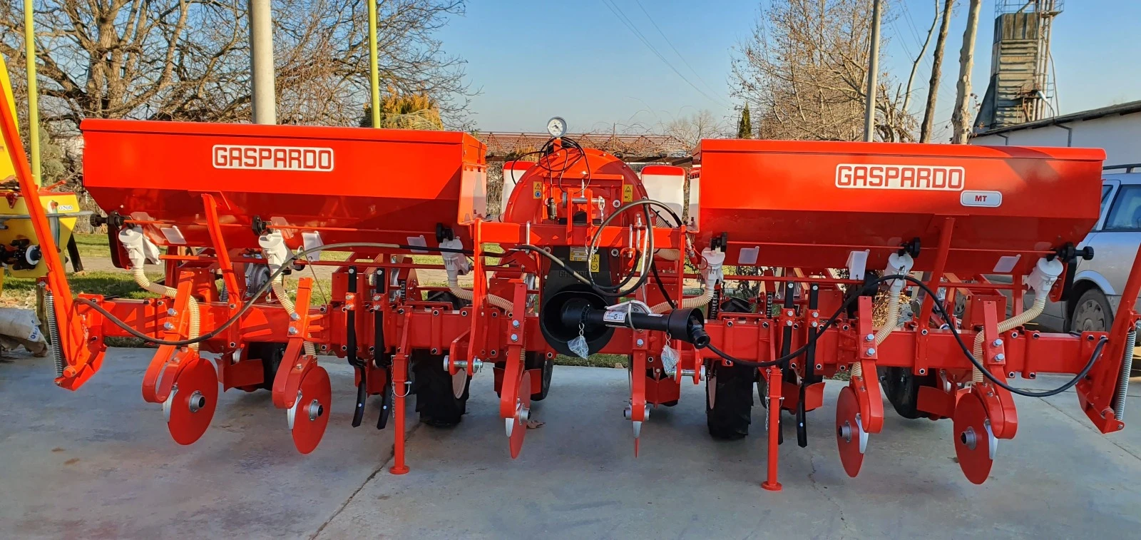 сеялка за пролетници с торовнасяне Марка Gaspardo модел МТ 6R Описание и технически характеристики: ПРОИЗХОД: ИТАЛИЯ Налична в Бадата на Универсал-НВГ ООД Триточково окачване към задна навесна система Брой редове 6 с междуредовo разстояние 70 см Работна ширина 4. 20 метра Маса 1050 кг Изсяващ апарат с двоен диск Дистрибуция на семената: пневматично Обем на бункерите за семена: 6 х 36 литра Торовнасяне с двоен диск Обем на бункерите за тор 2 х 280 литра Хидравлични маркири Карданно задвижване Включени два комплекта изсяващи дискове за слънчоглед и за царевица V образни притъпкващи колела Опционално оборудване: Компютър за следене на изсяването - 2200 лева без ДДС