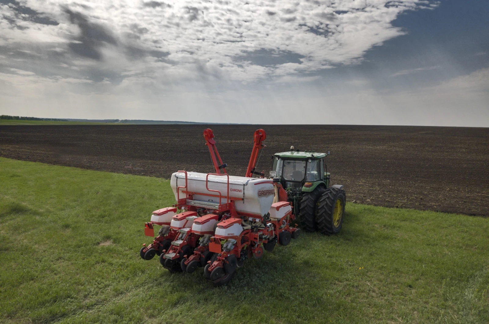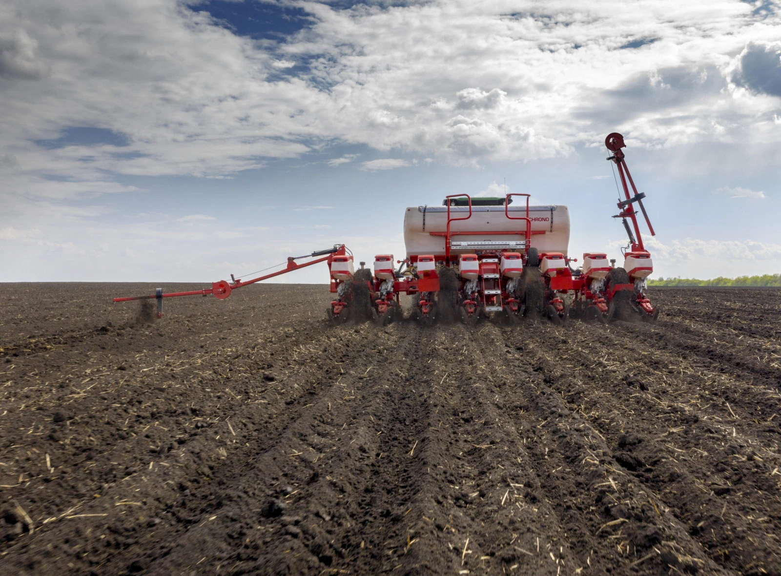 Сеялка за пролетни култури Gaspardo Модел Chrono 708 ОПИСАНИЕ И ТЕХНИЧЕСКА ХАРАКТЕРИСТИКА: Прикачна Сеялка с 8 реда на разстояние 70 см със Секции за семена с обновен дизайн и вместимост 60 литра Обем на бункера за тор 1600 литра Дисков изсяващ апарат с притъпкващи колела с V-образна форма, които също служат и за определяне на дълбочината на изсяване Хидравлична телескопична рама позволяваща свиване на рамата до транспортна ширина 3 метра Дисков колтер за торовнасяне Иновативен Изсяващ апарат CHRONO, който е смесица от две системи /Вакум и Налягане/, позволяващ работа със скорост 15 км/ч и абсолютно точно изсяване Дискове за сеитба на Царевица и Слънчоглед Въздушно Регулиране на натиска на на притъпкващото колело от 70 до 400 mbar Оборудване ISOBUS модул позволяващ работа с всички ISOBUS Терминали Автоматично изключване на Секциите при препокриване Собствен автономен Компресор за въздух Работа с Програмни карти за Променлива сеитбена норма Хидравлични маркири Необходима мощност на трактора 150 к. с. LED светлини Подходяща за Конвенционална, Директна и Полудиректна сеитба Цена без ДДС: 162 000 лева Опционално оборудване: Оборудване за Микрогранулиран тор Навигационна система RAVEN CR7 Софтуери ISOBUS и Section Control Дискове за почистване на браздата (Row cleaner) Дисков Коутер пред изсяващия диск (Row opener)