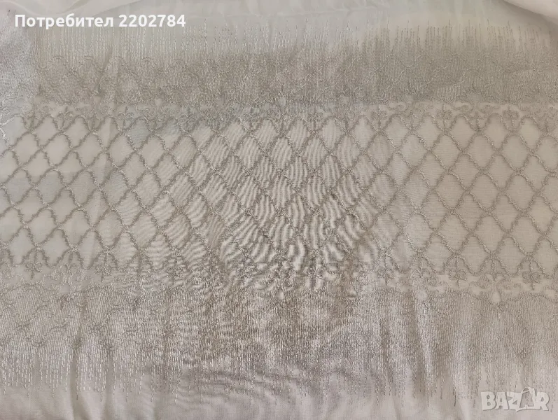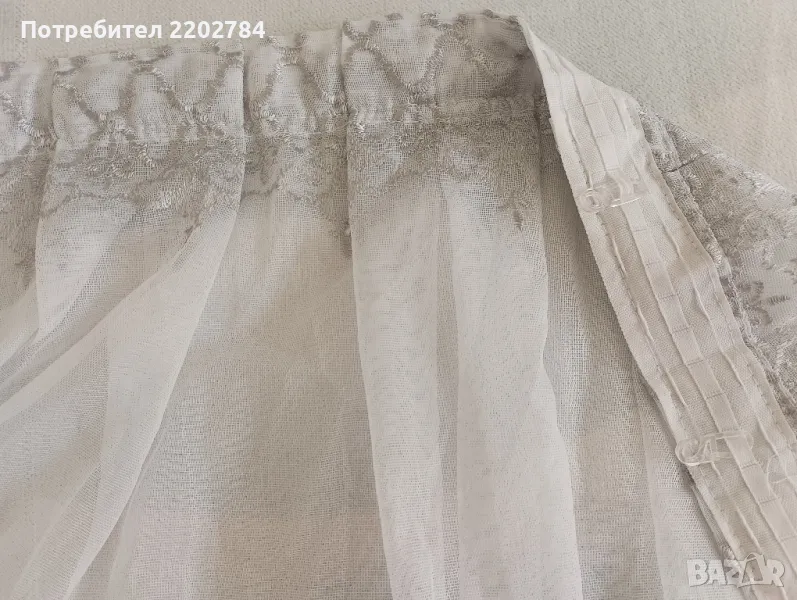 Последно е единично тънко бяло перде с красиви бродерии в сиво.Бродериите са с коприна.С перделик и пластмасови кукички за закачане.Размери: ширина в горната част 100см, ширина в долната част 250см, дължина 140см.Без забележки.
