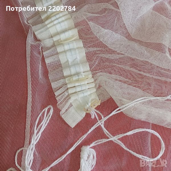 Вторите са комплект от два броя дантелени пердета в цвят шампанско с прекрасен голям бурдюр.С перделик и с кукички и запазени шнурове и затова може да се регулира ширината според нужната.Размери на едното: ширина 400см ( 4м), дължина 115см.