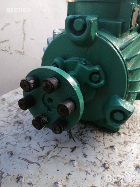 Продавам електрически двигател с мощност 5, 5 киловата, 2850 оборота в минута, диаметър на ос 28 мм, взривозащитен