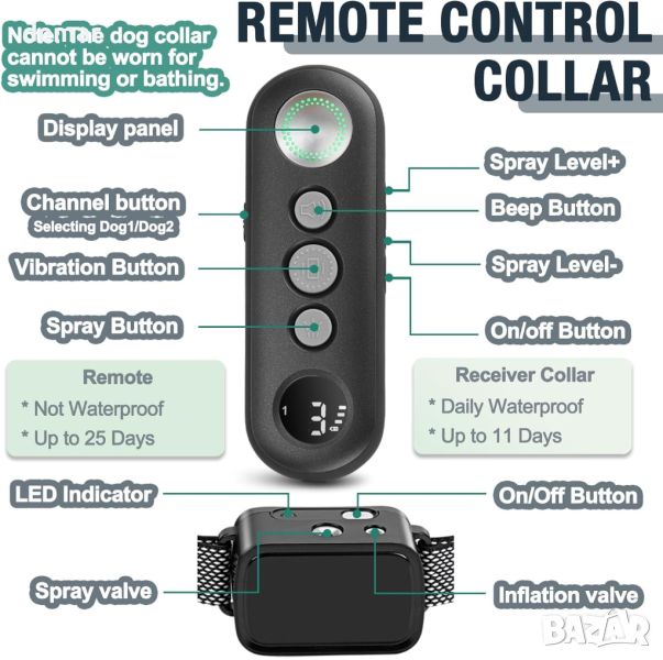 Този нашийник със спрей от цитронела осигурява безопасно, ефективно и хуманно обучение за кучета, като обезсърчава нежеланото поведение с взрив от спрей от цитронела, опции за вибрация и звуков сигнал. Разполага с 3 тренировъчни режима (Citronella Spray + бипкане, вибрация + бипкане, само бипкане) и 3 нива на пръскане (високо, ниско, без пръскане), контролирани от дистанционно с обхват до 1000 фута. Нашийникът е подходящ за кучета над 8 lbs и 8-27 инча в размер на гърлото, с капацитет за многократно пълнене от 30-35 спрейове на кутия. Включва акумулаторна батерия, издържаща до 11 дни за нашийника и 27 дни за дистанционното, въпреки че е важно да избягвате контакт с вода, тъй като не е водоустойчив. Индикаторът за изтощена батерия осигурява навременно презареждане, а правилната техника за презареждане гарантира ефективно използване на спрея.