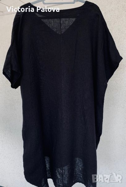 Роклята е без шев по рамото, 92см, ГО - 75см, дължина отпред - 90см, отзад - 96см. Широчината на нивото на джобове е 83см . Дишащ лен, джобовете са украсени.