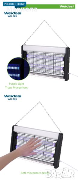 Принцип на работа: Лампата за унищожаване на комари използва мощни и усъвършенствани ултравиолетови светлинни вълни за ефективно привличане на комари. Привлечете комарите биват унищожени с електрошок .