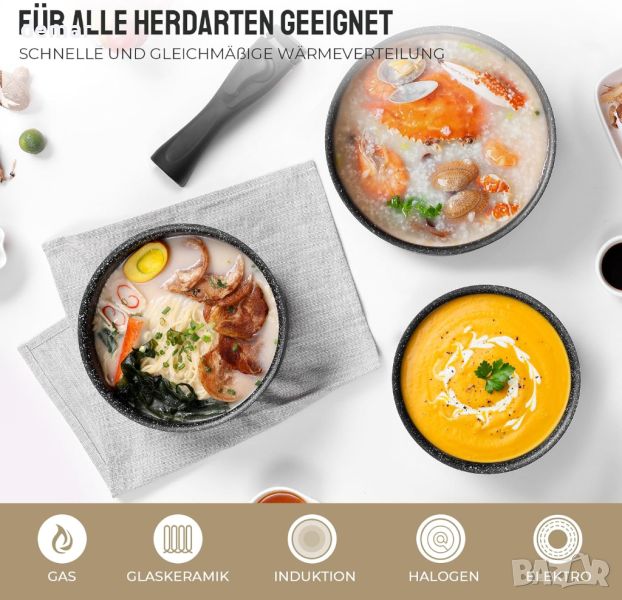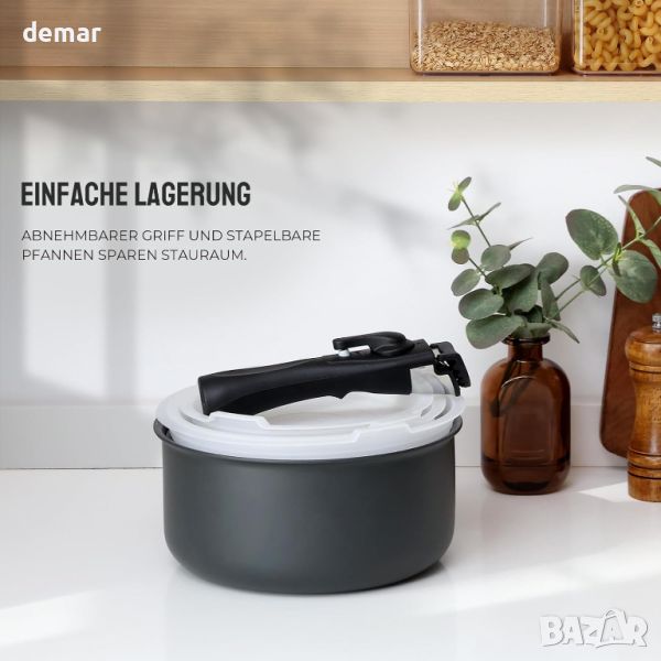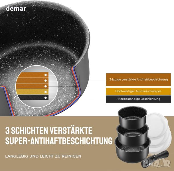 Комплектът черни купи разполага с издръжливо, устойчиво на петна незалепващо покритие, което предпазва основата от пожълтяване или изгаряне, дори при продължителна употреба. Съвместим с всички видове котлони, включително индукционни, газови, електрически, стъклокерамични и халогенни, неговата композитна основа от неръждаема стомана осигурява равномерно разпределение на топлината и бързи резултати при готвене. Изработен от висококачествен кован алуминий, готварският съд предлага отлична топлопроводимост и устойчивост на надраскване, може да се мие в съдомиялна машина и във фурна до 240°C (без дръжки). 3-слойното незалепващо покритие подобрява освобождаването на храната и улеснява почистването. Подвижната дръжка има двоен предпазен механизъм за сигурно боравене, остава хладна по време на готвене, а ергономичният й дизайн осигурява удобен захват. Дизайнът с възможност за подреждане спестява кухненско пространство и осигурява лесно почистване.