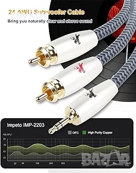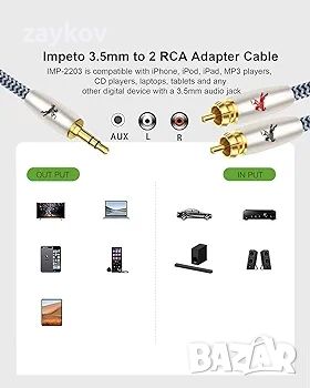 Широка съвместимост на 3,5 mm RCA кабели: IMP-2203 3,5 mm към 2 мъжки RCA аудио кабел е съвместим с iPhone, iPod, iPad, MP3, CD плейъри, лаптопи, таблети и всякакви други цифрови устройства с 3,5 mm аудио конектор , както и домашни аудио системи, като усилвател или приемник с RCA конектори