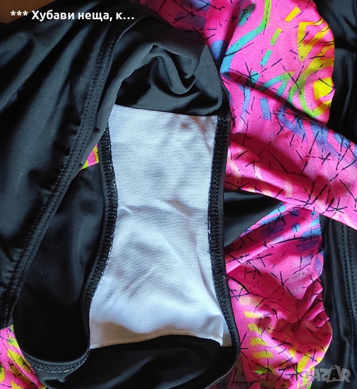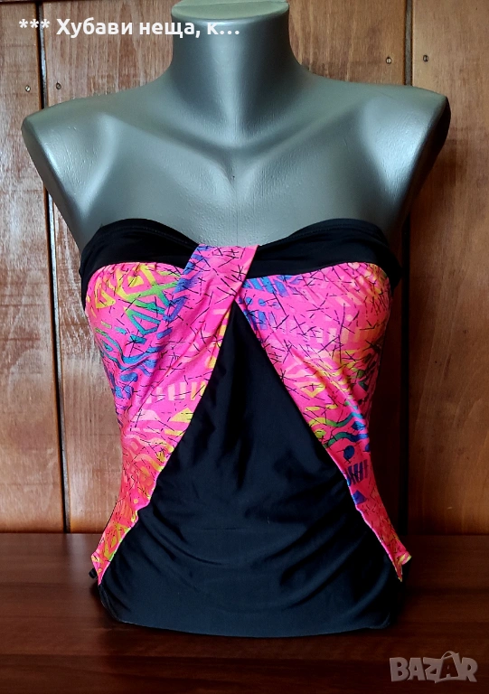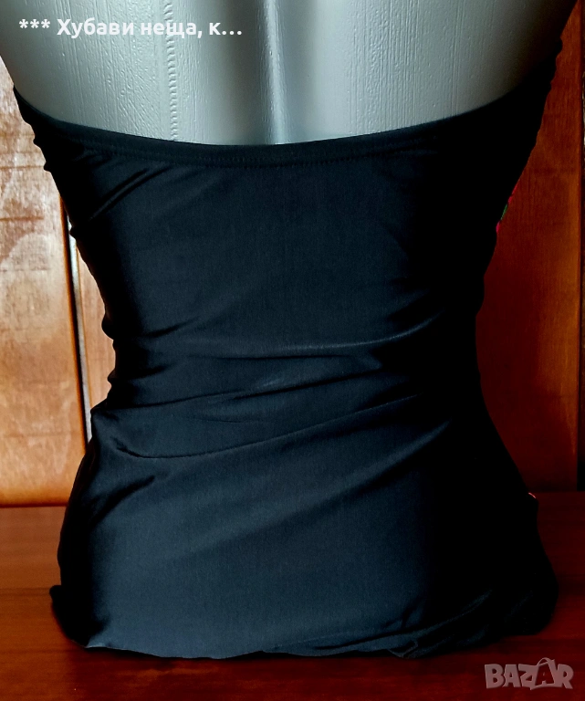 Отпред е в два цвята - черна основа и геометрични фигури на светло малинена основа с интересно прехвърляне. Материята е стегната и еластичнаq бързосъхнеща. От страни на бюста има поддържащи банели. На тялото стои много красиво. Ако го закупите с него подарявам и електриковия бански, който е мн красив, има заб. на ластика на гърба, но при обличане не прави впечатление.