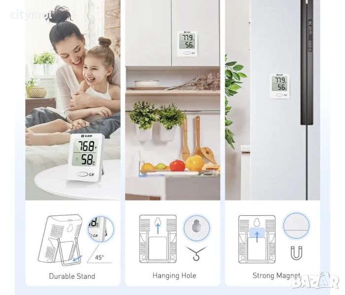 Стайният термометър с влагомер може да се фиксира с магнит, да се постави на масата или да се окачи на стената. Удобната функция за инсталиране е подходяща за всеки тип стая, като кухня, градина, оранжерия, мазе, бебешка стая, стая за китара или офис.