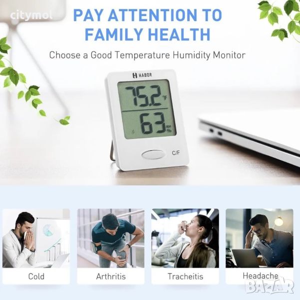Иконите на индикатора за ниво на комфорт показват удобни, неудобни и нормални условия. Хигрометричният термометър Habor измерва вътрешната влажност и температура, така че можете да регулирате настройките на овлажнителя и изсушителя на въздуха. Перфектен за наблюдение на семейните условия на живот и здраве, предотвратяване на настинки, суха кожа, астма, алергии или мухъл.