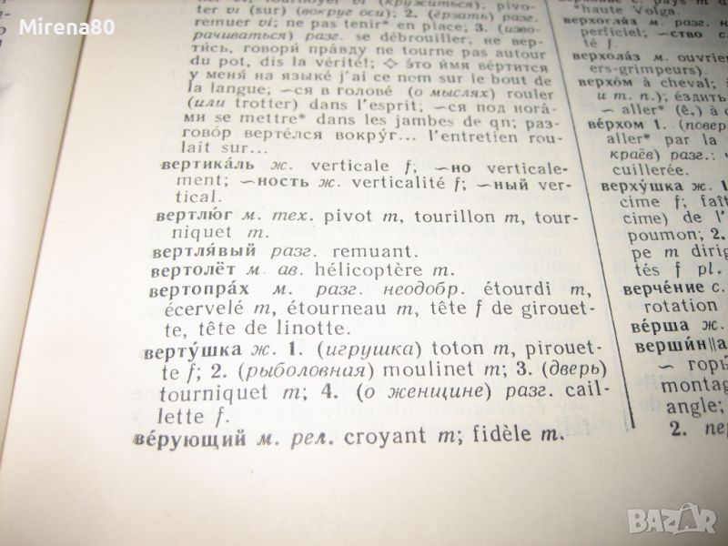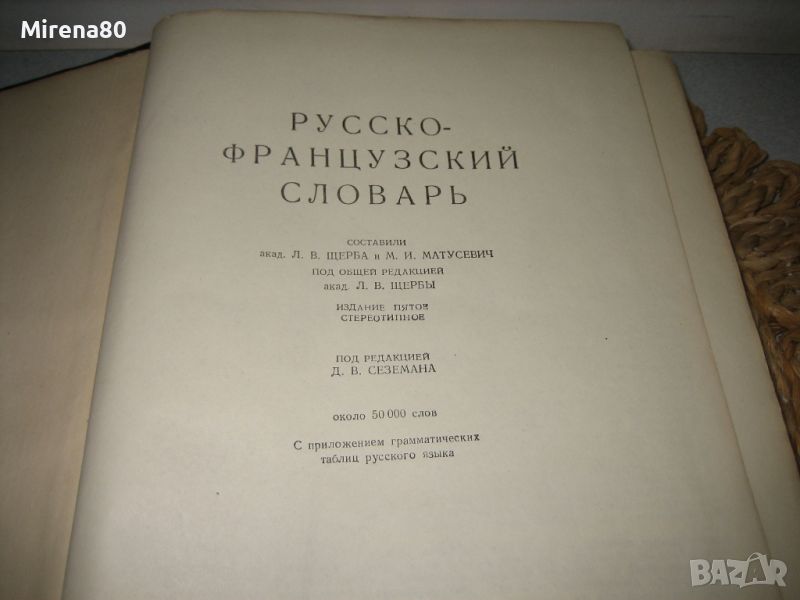 Изд. Государственное издательство иностранных и национальных словарей - Москва - 1956 г. Автор - К.А.Ганшина.Твърди корици, 783 стр. Книгата има закъсване отвън (тясната кожена част от корицата липсва), но самото книжно тяло е здраво и шито. Може да се лепне тъмен картон, ако дразни, но така или иначе е чисто козметична забележка. Разполагам и с френско-руския речник от същото издателство !