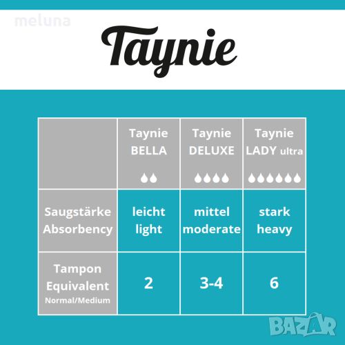 Taynie прави живота ви по – приятен и нашата планета малко по – зелена. Това е хигиенен продукт, който може да се пере и използва многократно, спестява пари в дългосрочен план и защитава околната среда. Бикините Taynie са силно абсорбиращи, безопасни, влагонепропускливи и дишащи.