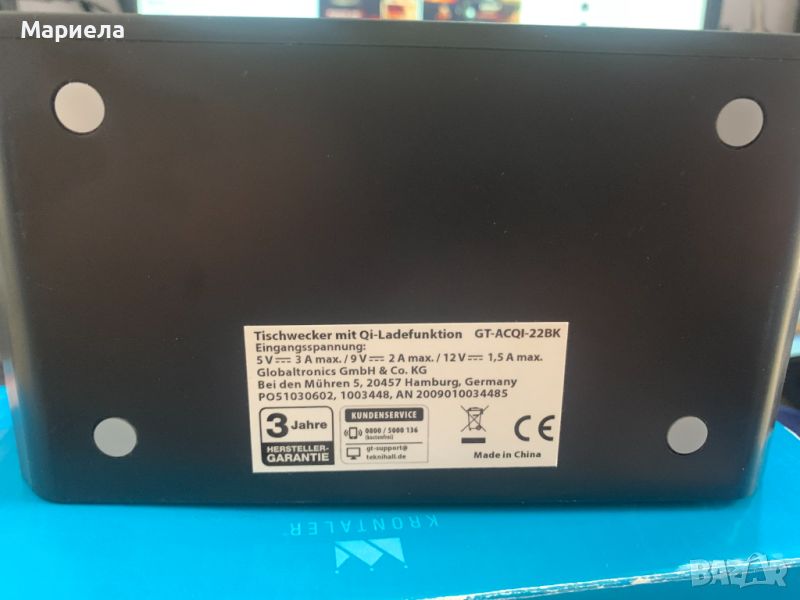Часовниците са закупени от разпродажба в Германия .Има LED дисплей , който можете да димирате .Можете да настройвате 2 аларми .Има функция за отлагане на алармата .Върху часовника е безжичното зарядно за телефон .Към часовника има дълъг USB кабел с адаптер .Часовникът показва още дата и месец .Също така можете да виждате постоянно каква е температурата в помещението .