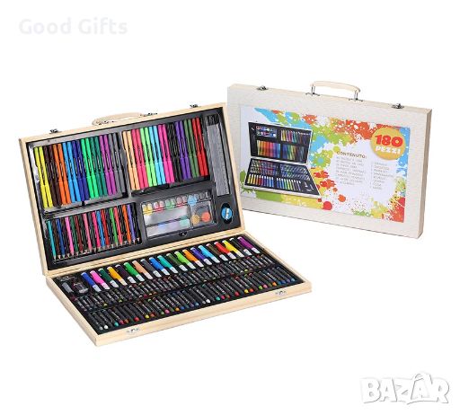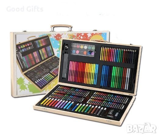 Дървен куфар за рисуване, 180 части, пастели, флумастри, водни боички, моливи