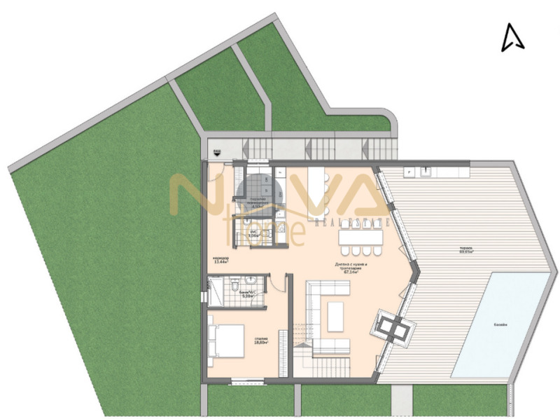 На първи етаж са разположени коридор 13,4 кв.м., просторен дневен тракт с кухненски кът 67 кв.м. с излаз на веранда 80 кв.м., на която е проектиран басейн с пармери 3 на 6 м., спалня 18,6 кв.м., баня с тоалетна 6 кв.м., морко помещение 4,5 кв.м., отделно тоалетна 3 кв.м. и вътрешно стълбище.