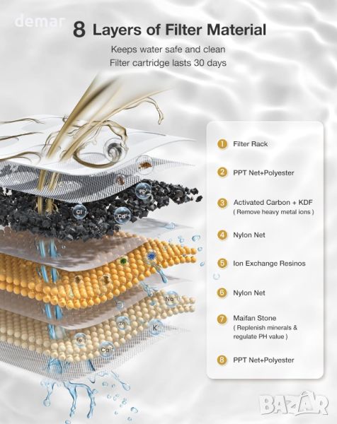 котка суха, той също така предлага авариен източник на вода по време на прекъсване на електрозахранването. Усъвършенстваната 8-слойна филтрираща система, включваща активен въглен и йонообменна смола, пречиства и омекотява водата с живот на филтъра от 30-60 дни. Фонтанът включва интелигентни режими за подаване на вода, за да привлече котките да пият повече, насърчавайки по-добро здраве.