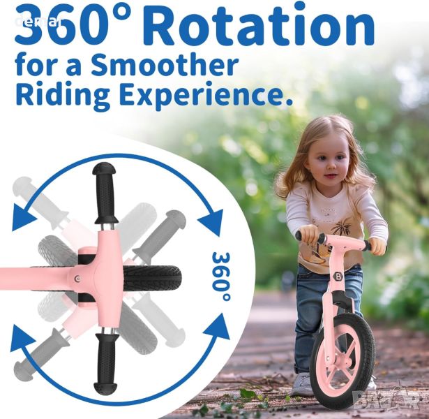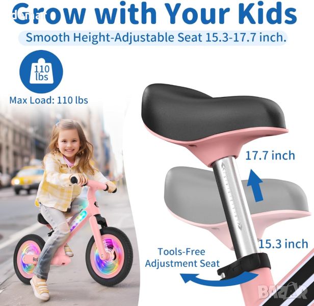 Детският балансиращ велосипед Super Cool Fun Ride разполага с LED мигащи светещи колела, които светят със скорост, и захранвани с батерии рамкови светлини с 20 режима на промяна на цвета. Създаден е да помогне на децата да научат баланс, управление и координация с ниска стъпаловидна рамка и регулиране на височината без инструменти (39 см до 45 см). Безопасността е приоритет с 12-инчови устойчиви на пробиване EVA гуми, въртящо се на 360 градуса кормило, неплъзгащи се дръжки и мека седалка. Здравата рамка издържа до 50 килограма, с ергономична подплатена седалка и изключително широки подложки за крака за комфорт. Лесен за сглобяване, тежи само 4 килограма и е компактен за лесно транспортиране.