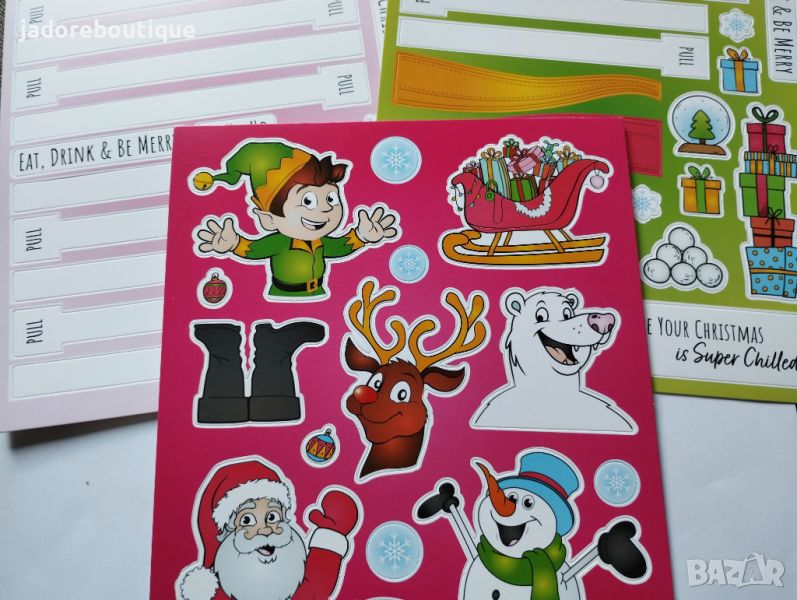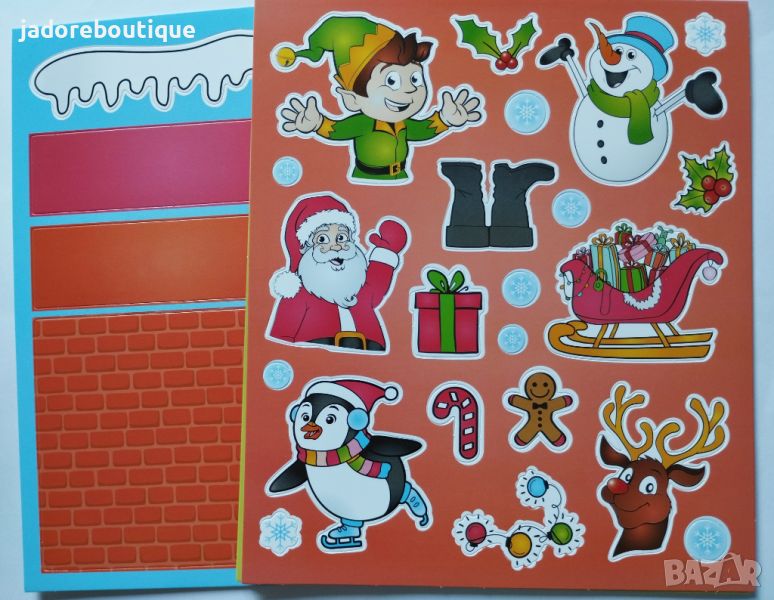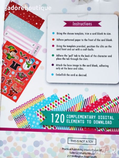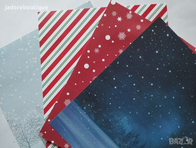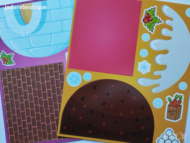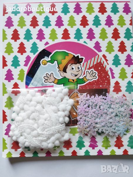 Комплектът съдържа : 106 бр изрязани елементи от картон, 4 листа едностранна дизайнерска хартия 20х17.5 см, 2 шаблона за картички, пакетче помпони и пакетче снежинки за декорация.