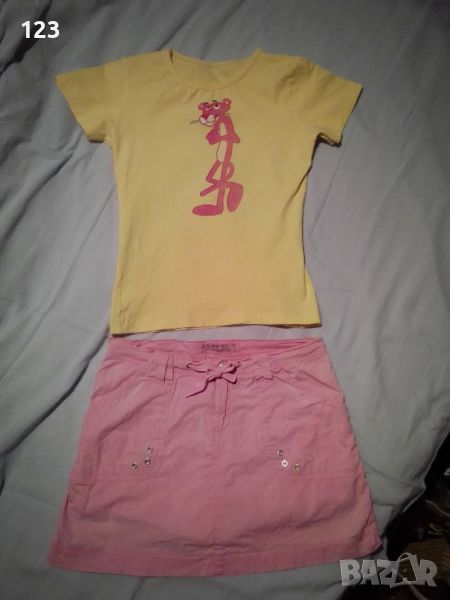 Комплект от интересна пола с панталонки, изглеждащи като пола , тениска Пинко розовата пантера и обувки в бонбонено розово ( по желание).