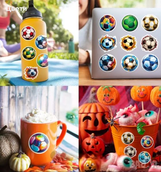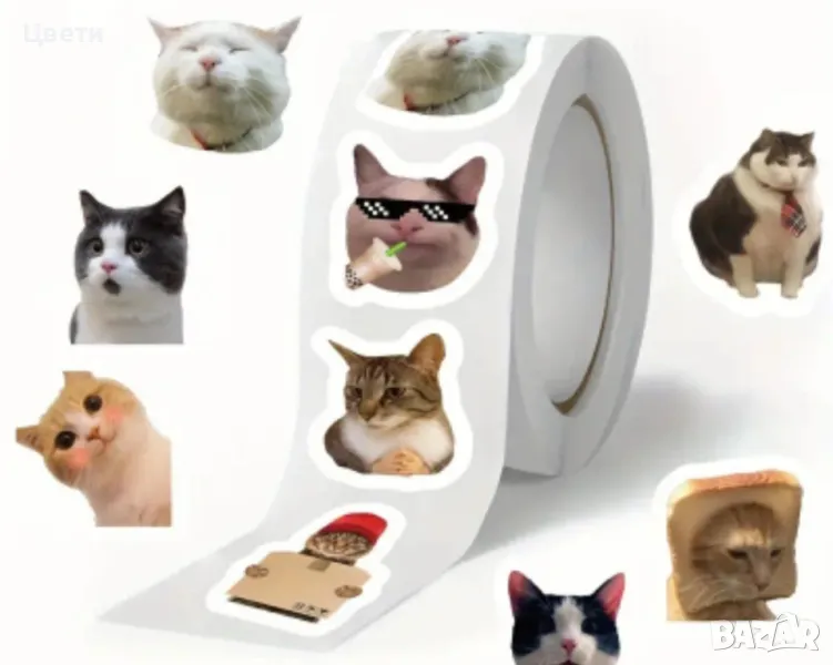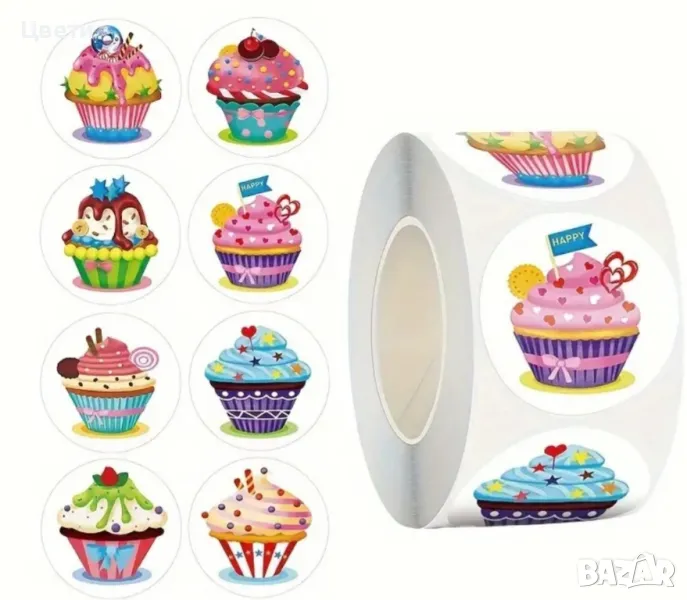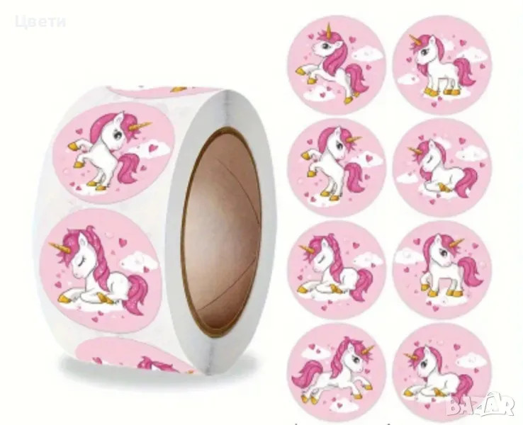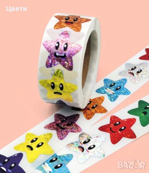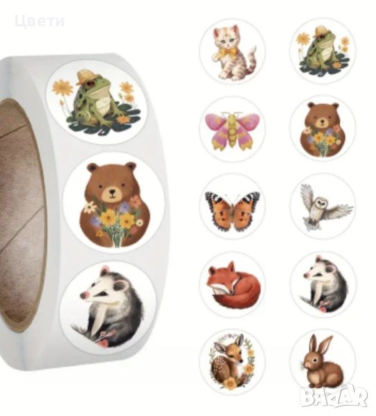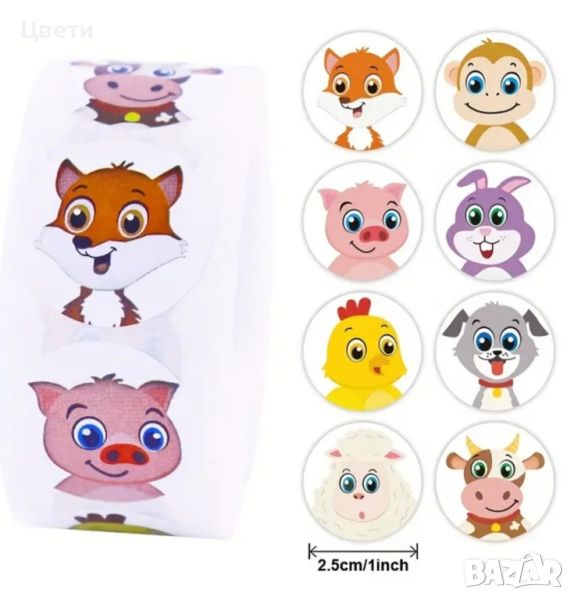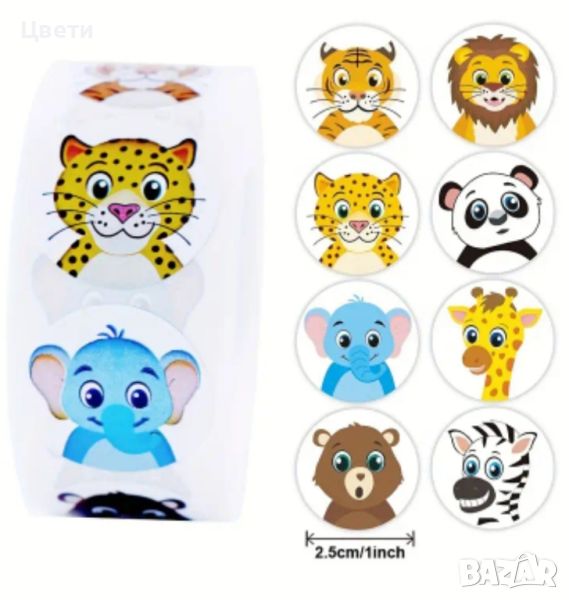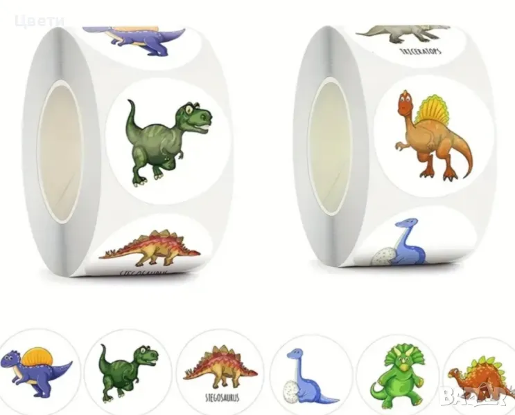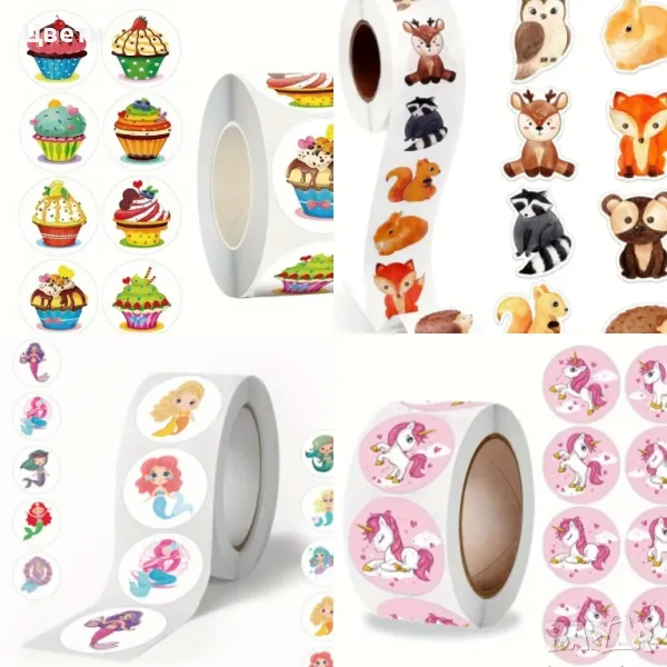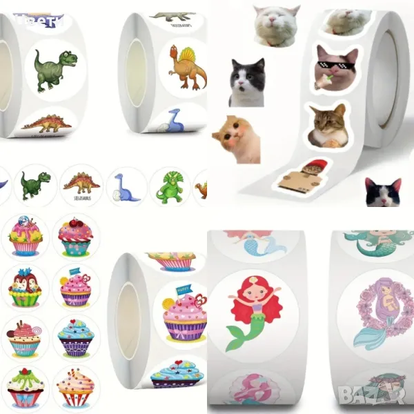 Стикери. Горски, диви и домашни животни, панди, звездички, сърца, коли, камиони, еднорози, русалки, кексчета, котки, динозаври- по 500 броя в ролка. Стикерите с футболни топки са 50 бр.