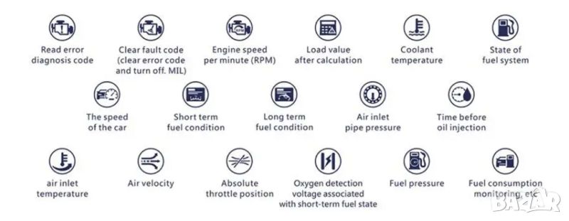 Кодочетец с функции ЧЕTEHE и ИЗТРИВАНЕ на кодове за грешки. Базата данни в диагностичните приложения съдържа повече от 3000 кода за неизправности, както и кратко описание на проблемите.