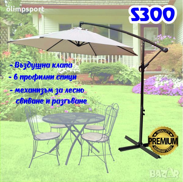 Големият градински чадър изисква стабилно захващане към земята или масивни плочки за баланс.